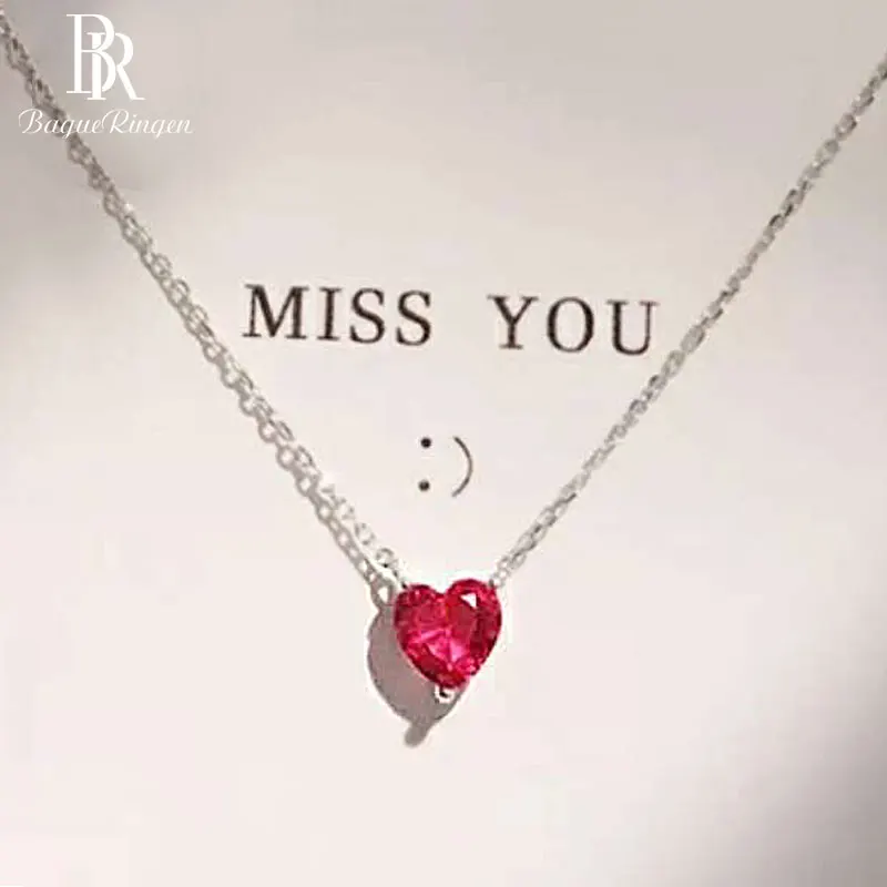 New Begua Ringen 925 Sterling Silver Necklace Red Heart-shaped Clavicle Chain Simple Crystal for Women